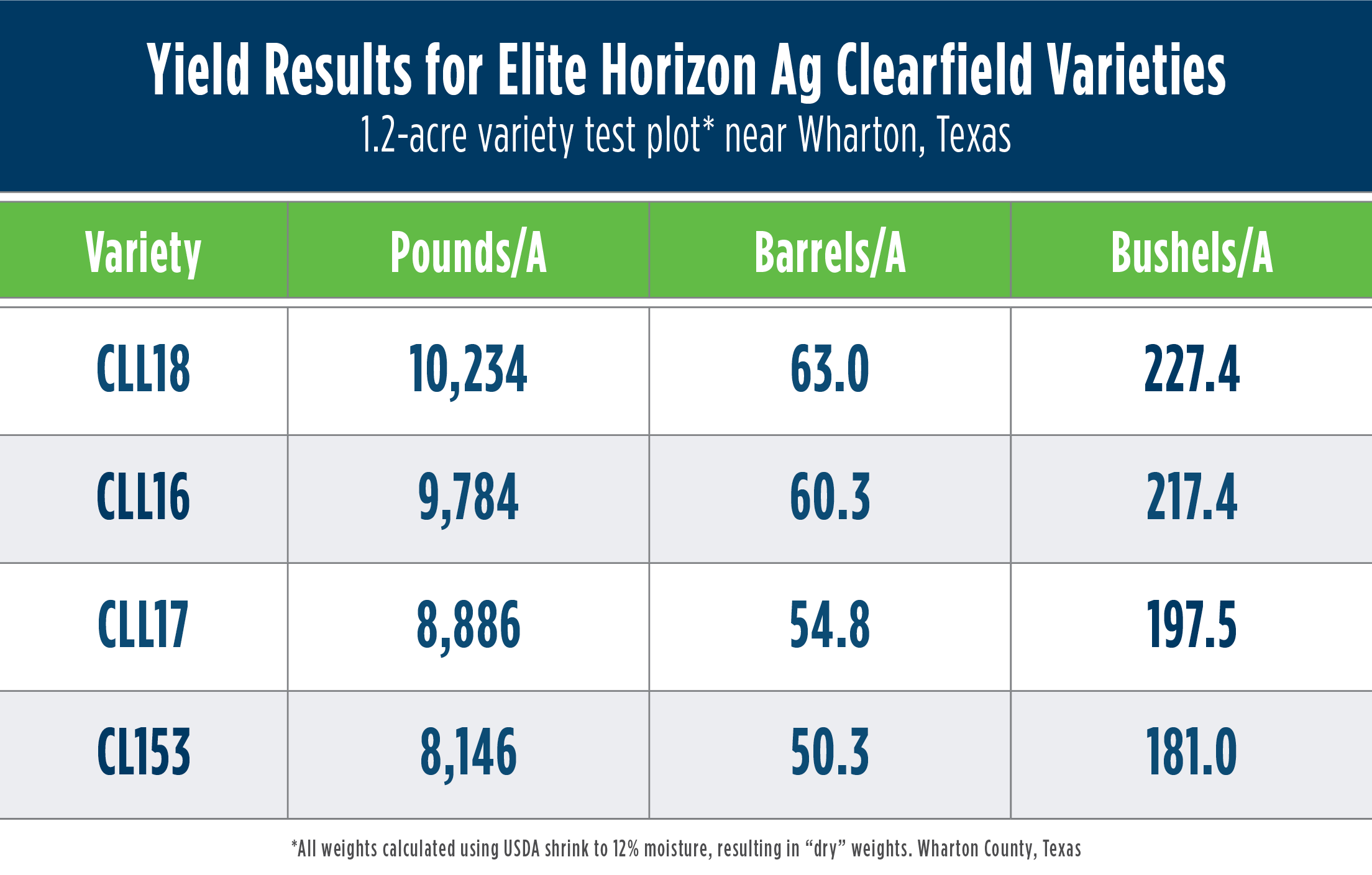 Rice harvesting is wrapping up in many areas of the South, and we’re seeing some exciting results from elite Clearfield varieties like CLL16 and, new for 2023, CLL18. For instance, a 1.2-acre variety test plot* near Wharton, Texas produced the following: